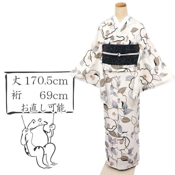 > 【小紋】 長尺 特選 モダン 椿の花模様 『白ちりめん地』 袷正絹着物 KS3-16