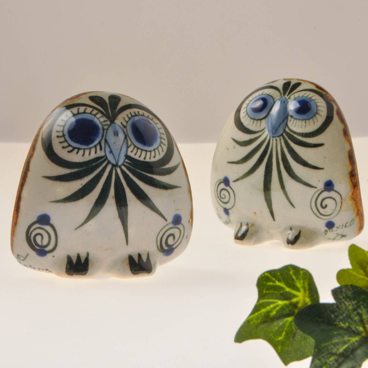 - ■■ メキシコ トナラ焼 フクロウ2対 置物 飾り物 梟 インテリア小物 雑貨 コレクション 縁起物■■