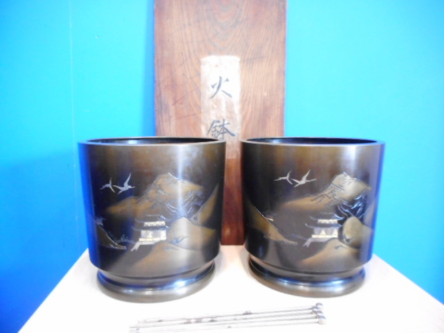 > ◇昭和レトロ 火鉢 一対 山水 彫刻 真鍮製 2客一対 金属工芸 黄銅 手炙り 茶道具 茶席 茶室 囲炉裏 古道具 USED品 木箱入り