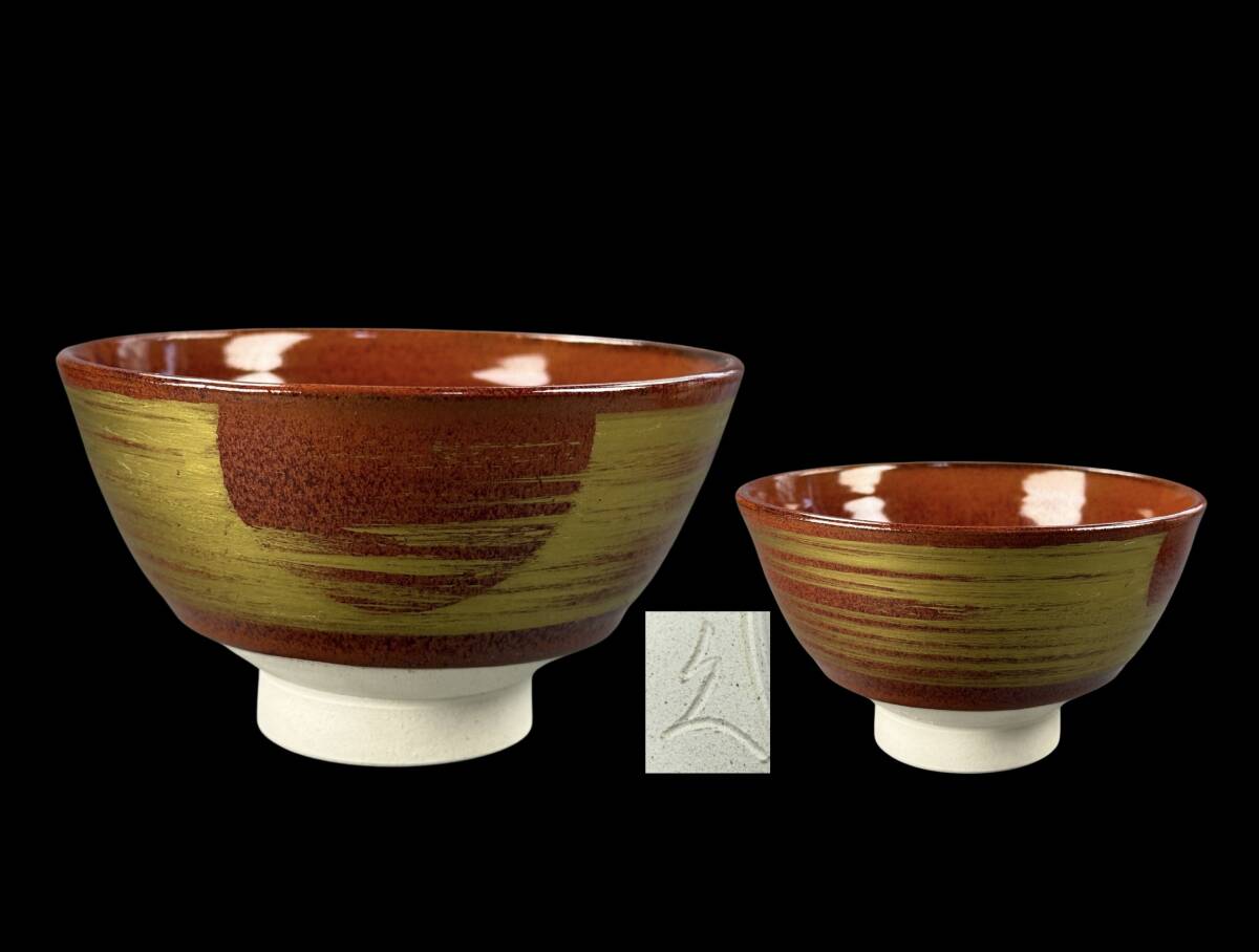 - 【偲】京焼 赤金 日出 抹茶碗 茶碗 茶道具 在銘 直径約13㌢ c-156