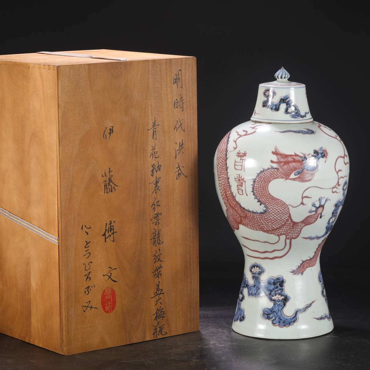 > 明時代 洪武 青花 染付 釉里紅雲龍文大蓋大梅瓶 唐物 箱付き 陶磁器 中国美術 古美術 置物 高さ50cm 口径8cm 胴径24.5cm RG286