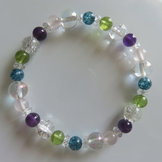 - 送料無料、ペリドット、アメジスト、ローズクォーツ、レインボーオーラ、水晶のブレスレット