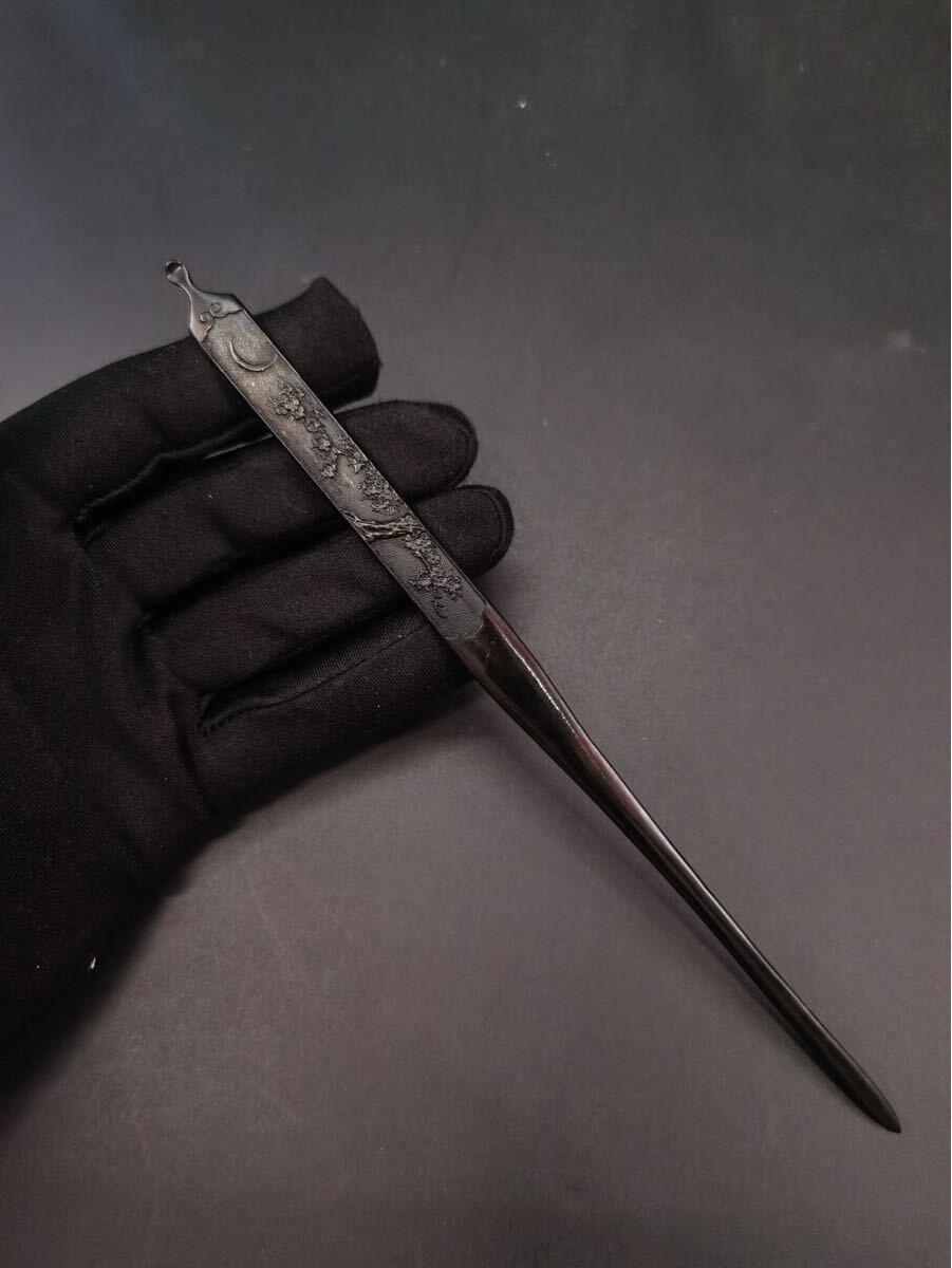 - s-160 月下桜樹図笄 容彫 日本刀 武具 刀装具 銅製 小道具 鍔 目貫 縁頭 拵