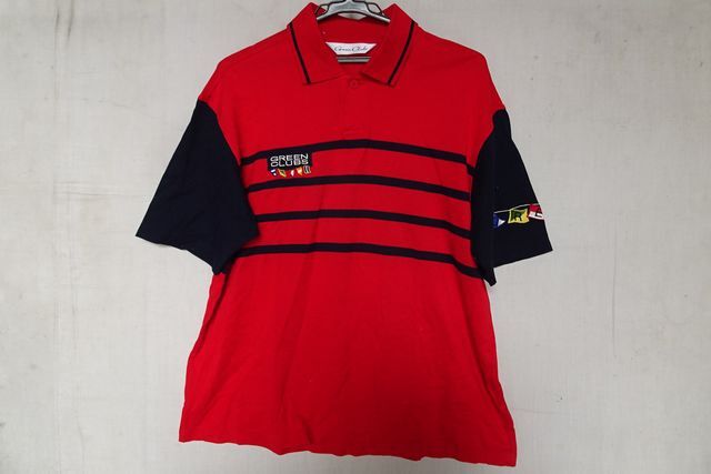 - Green Clubs/半袖ポロシャツ/ゴルフウェア/鹿の子素材/一部紺ボーダー柄/袖紺切替配色/ガーランドししゅう/赤/レッド/サイズ4(6/17R7)
