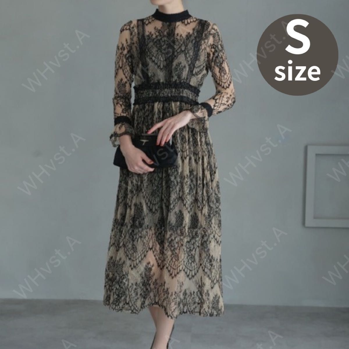 - 上品 レース ワンピース S 黒 オケージョン ドレス 結婚式 パーティー お呼ばれ 体型カバー