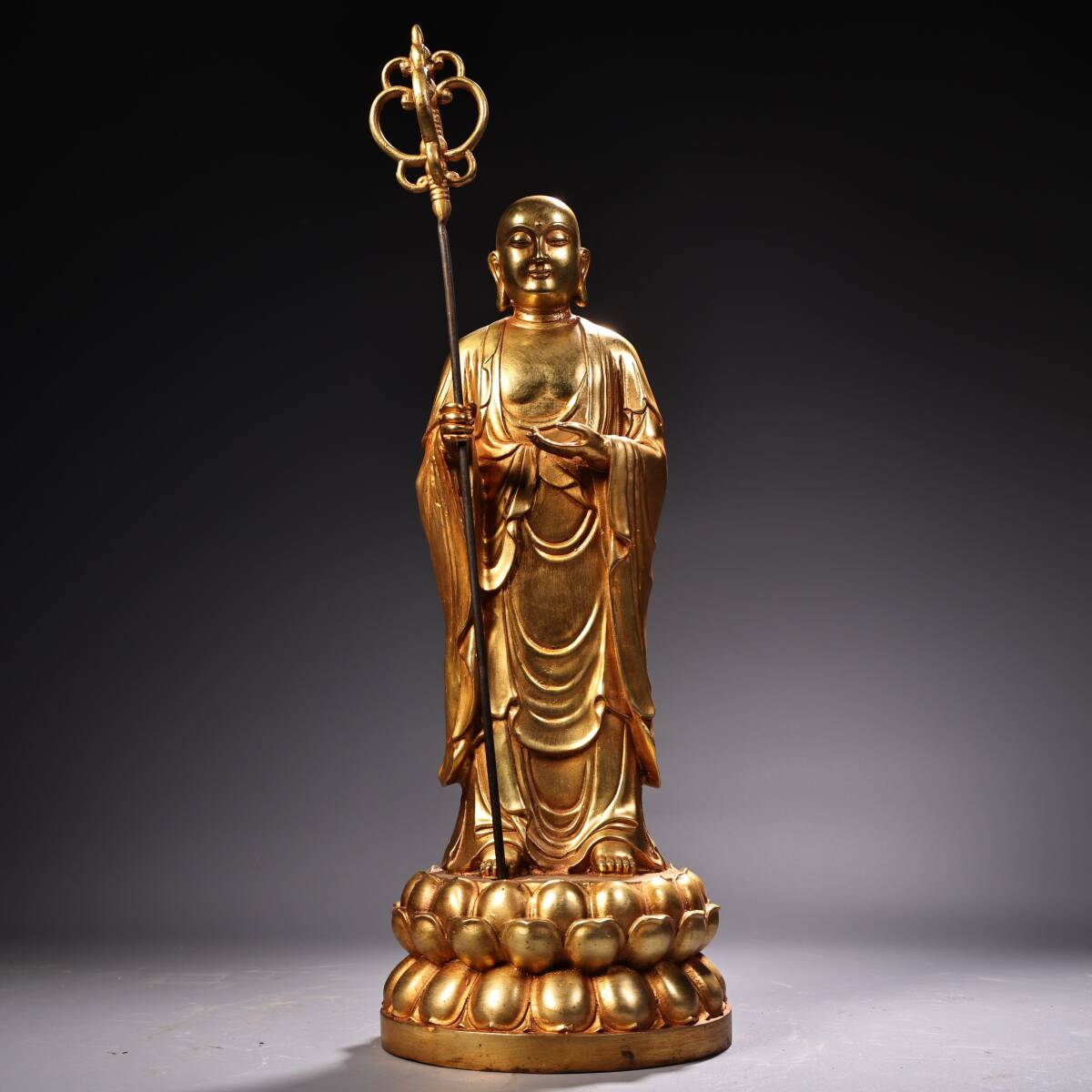 - 旧蔵 清 純銅 全銅 高レリーフ鏨刻 塗金地蔵王菩薩 仏像 奉納されていた 供養品 銅製品 銅器 極細工 中国古玩 骨董品 古美味 206-19