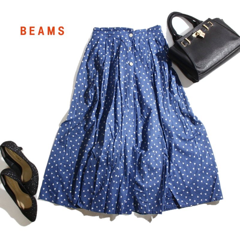 > 美品 BEAMS BOY ビームス 春 夏 可愛い お花 影 ドット 柄 プリント ギャザー ロングスカート フレアスカート ネイビー 紺 綿100% シャツ
