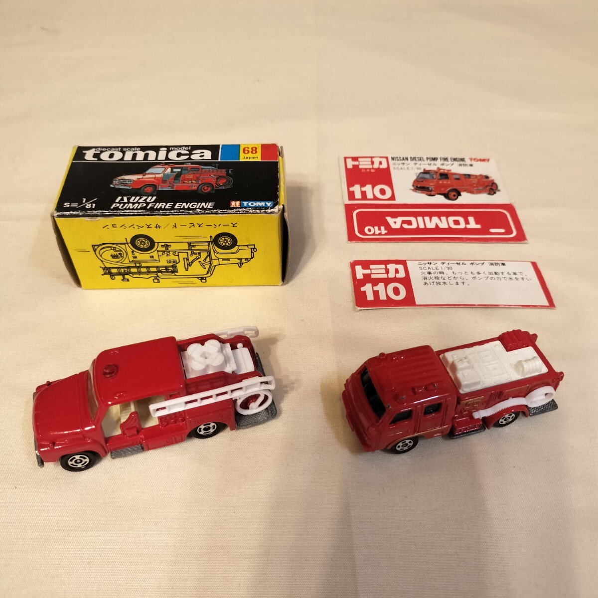 - K06174 ◆当時物 日本製 tomica/トミカ No.68 黒箱 いすゞ ポンプ 消防車/No.110 赤箱 ニッサン ディーゼル ポンプ 消防車 計2点セット◆