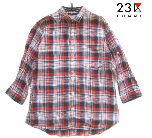 - 美品!!23区オム 23区HOMME*麻100% 胸ポケット付き 7分袖チェック柄リネンシャツ 48 実寸M 白×紺×赤 トラッド アイビー