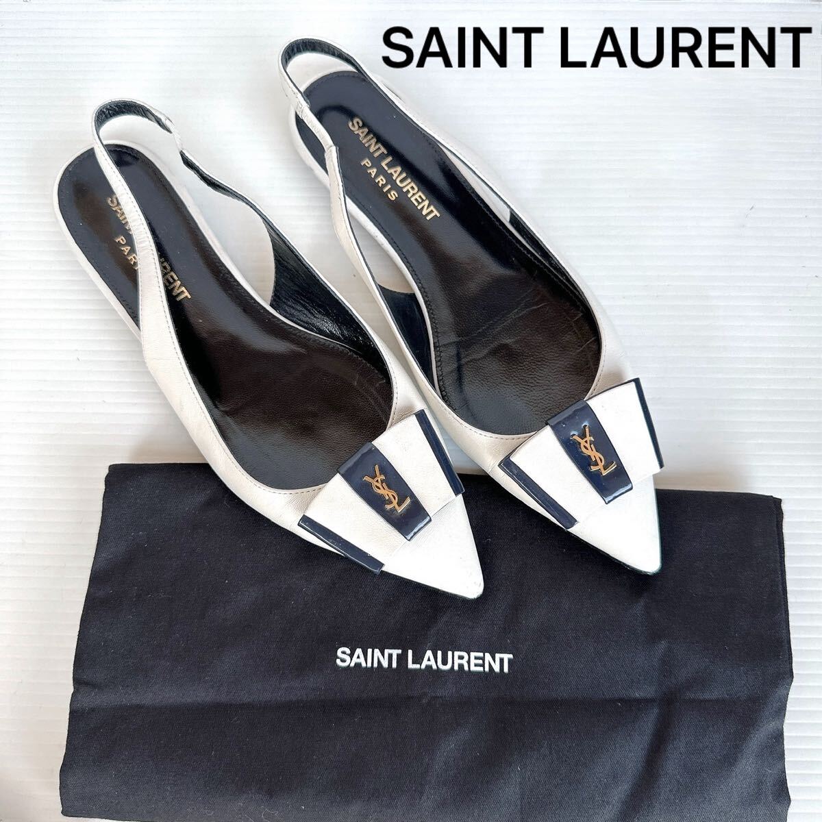 > 現行 SAINT LAURENT サンローラン YSL リボン ロゴ入り ポインテッドトゥ フラットシューズ パンプス サンダル ミュール アナイス 34 靴