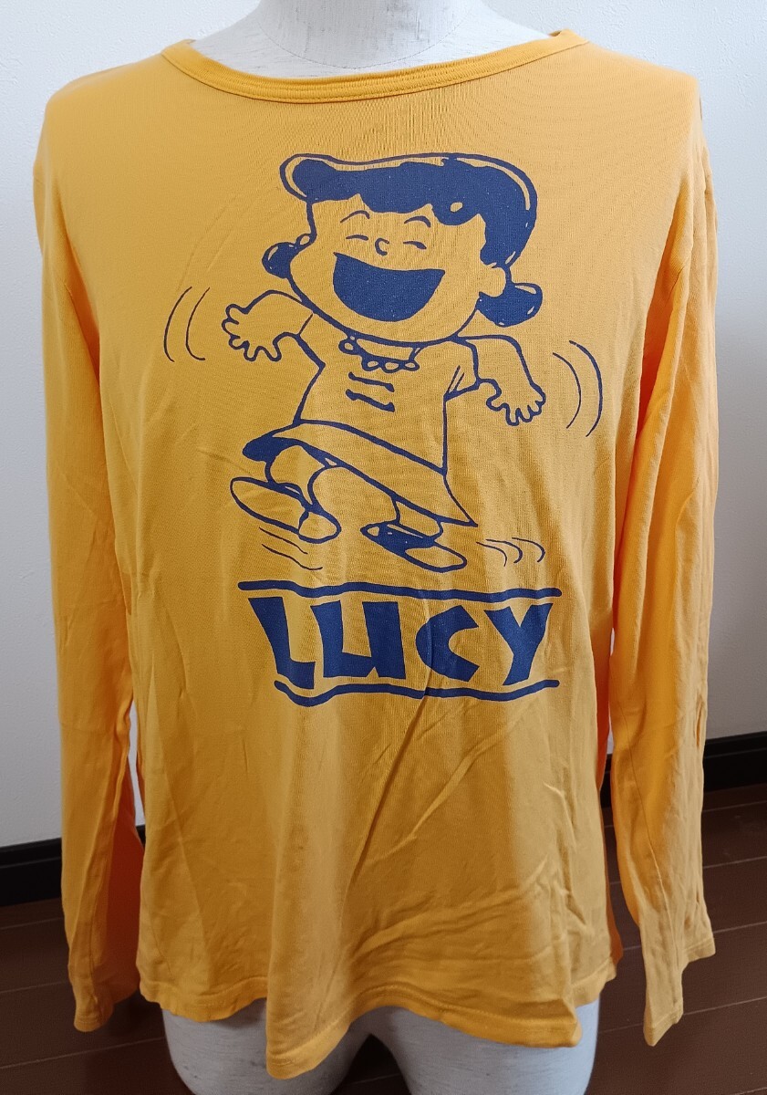 > 古着 LUCY ルーシー 長袖Tシャツ L イエロー 『come dance with me!』ピーナッツ スヌーピー ヴィンテージ 穴あき有