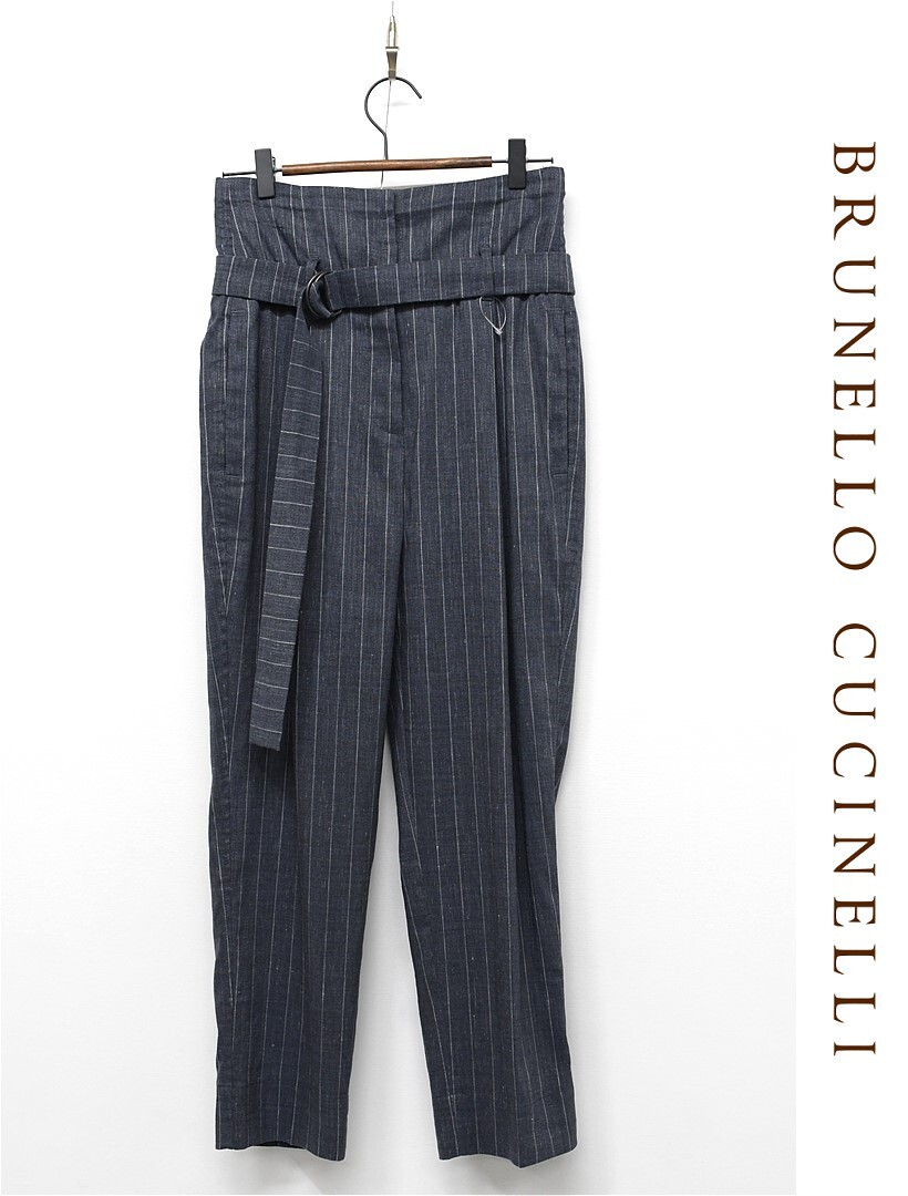 - Z124/美品 BRUNELLO CUCINELLI パンツ スラックス 1タック ハイウエスト ベルト ストライプ リネン ウール ストレッチ 36 S ブルーグレー