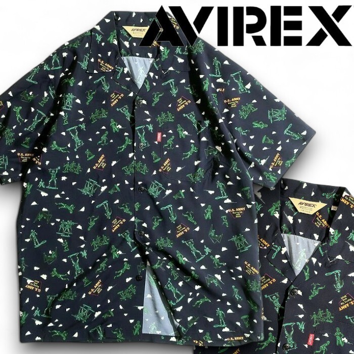 - AVIREX アヴィレックス 新品 清涼レーヨン トイソルジャー 総柄 オープンカラー 開襟 半袖 アロハシャツ 6125125 09 M ▲033▼50327k04