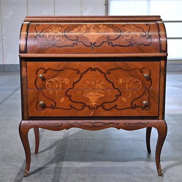 - イタリアアンティーク ロールトップビューロー ローズウッド材 木象嵌 真鍮 猫脚 チェスト 収納 引き出し ライティング ビンテージ