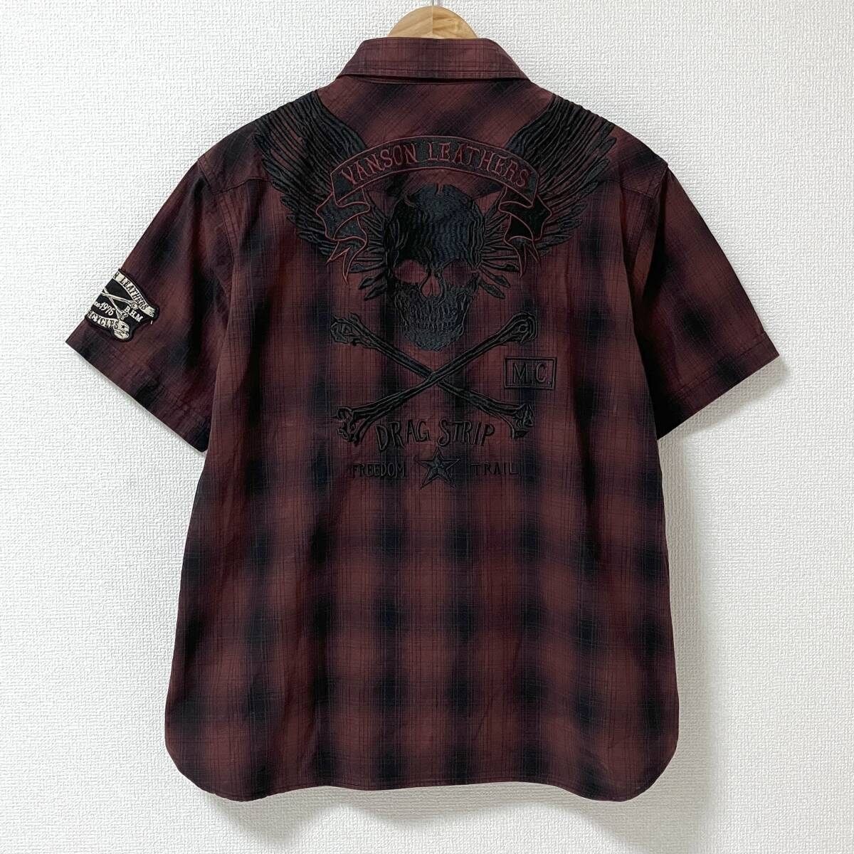 > VANSON スカル ウィング 刺繍 ワッペン 半袖 シャツ オンブレ チェック エンジ系 XLサイズ ヴァンソン バンソン 髑髏 5060338