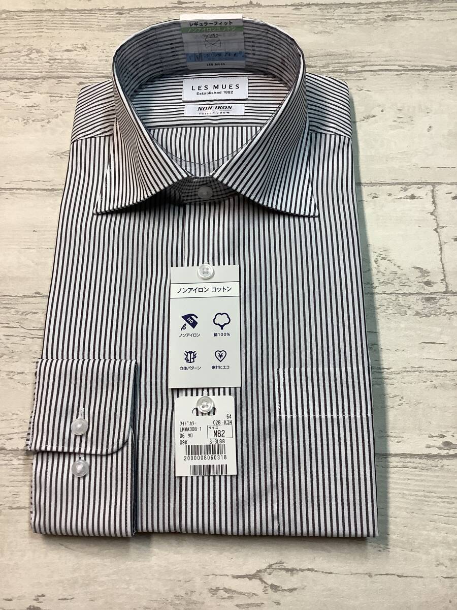 - 新品未使用 ★39-82 長袖Mサイズ ワイドカラードレスシャツ ★ノンアイロンコットン 綿100% ★黒ラインストライプ