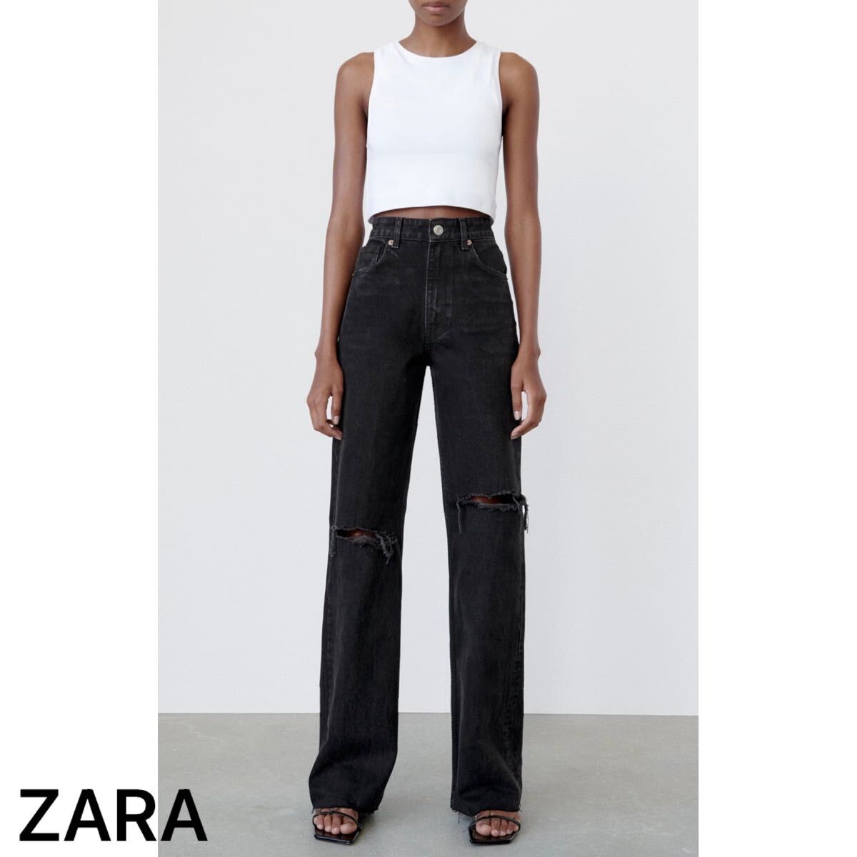 > ZARA ワイドレッグジーンズ ブラックデニム ハイウエスト レディース34 クラッシュ ザラ ボトムス 黒 カットオフ 切りっぱなし