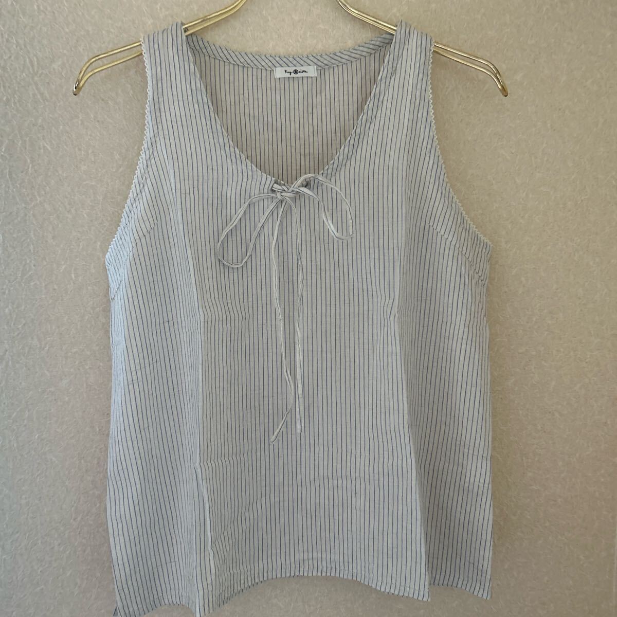 - リネン ストライプ トップス シャツ ノースリーブ シンプル 日本製 タンクトップ 袖なし 値下げ