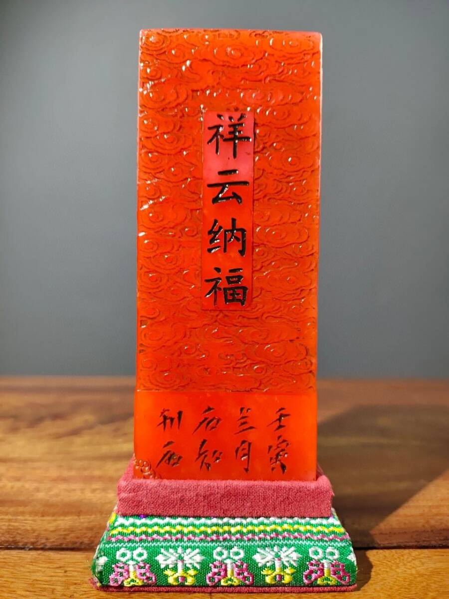 - 『館蔵珍品 寿山石 紅田黄石 細密彫 祥雲納福紋印章 印章 印鑒』文房具 書道品 貴重物品 収蔵品 中国古美術 時代物 古董品