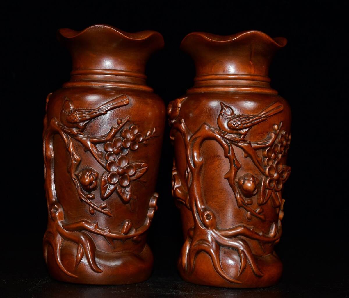 - 【超珍館蔵】黄楊木製 細密彫 喜上眉梢紋 花瓶一對 置物 賞物 古賞物 古董品 古美術品 時代物 旧家蔵出 稀少珍蔵品