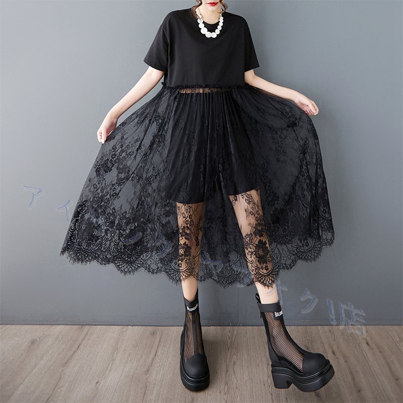 - 新品★夏 カジュアル 20304050代 ゆったり大きいサイズ おしゃれレース切り替え 透け感 半袖ロングワンピース 黒