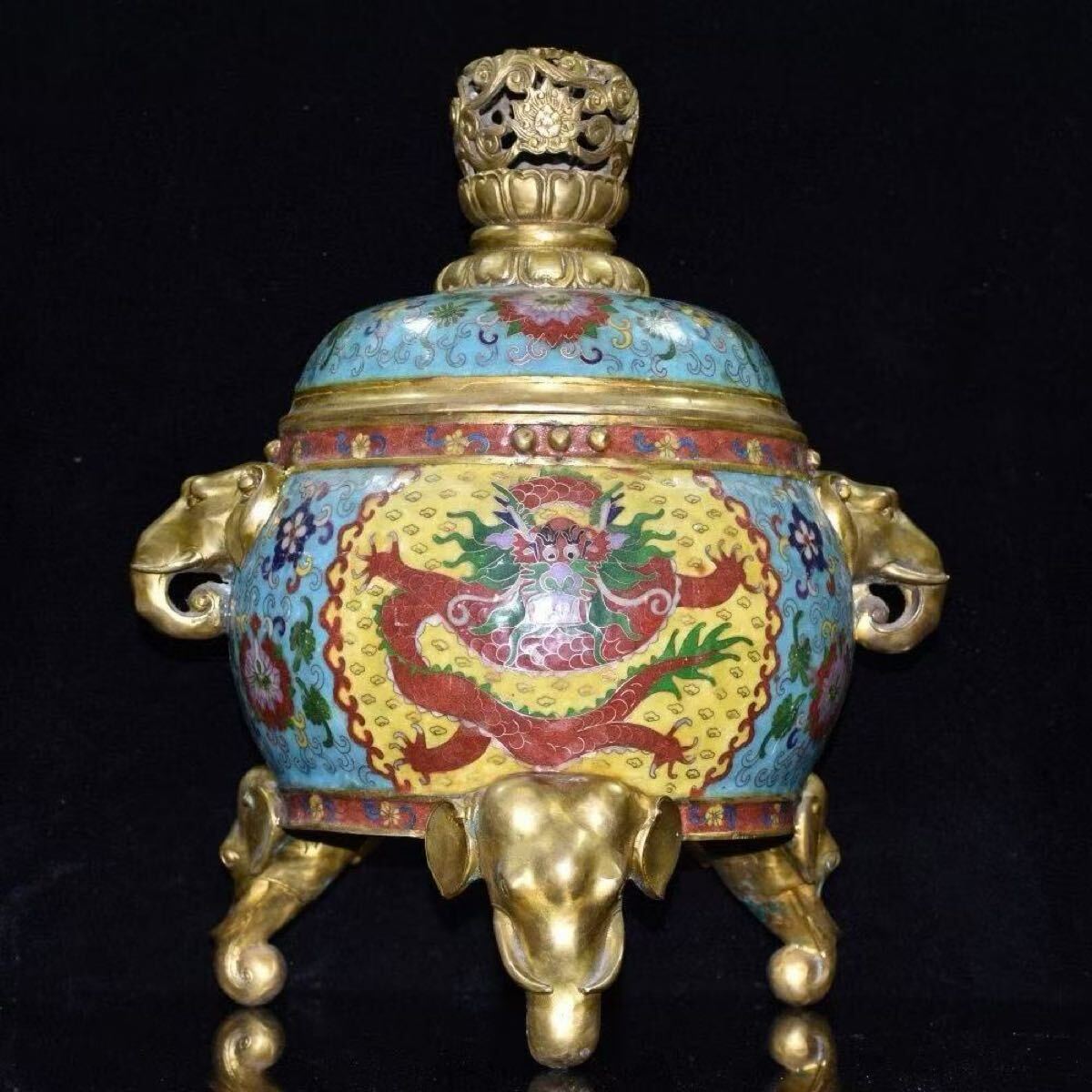 - 【伝】中国古美術 古玩 唐物旧蔵 開運純銅製景泰藍象足龍紋香炉 極細工浮彫 置物擺件 古賞物 風水物 鎮宅 中国骨董 大珍品レア 三足香炉