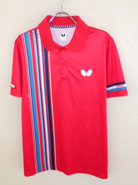 - z9062Butterfly★バタフライ★刺繍×ワッペン★ストライプ柄ポロシャツ★サイズL★JTTA★激安