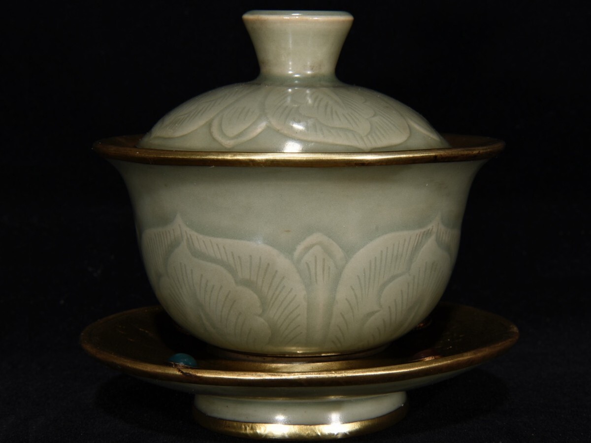 - 「宋 越窯 陶磁器 包銅塗金嵌寶石 蓋碗」染付 置物 擺件 古賞物 中国古美術 旧蔵出