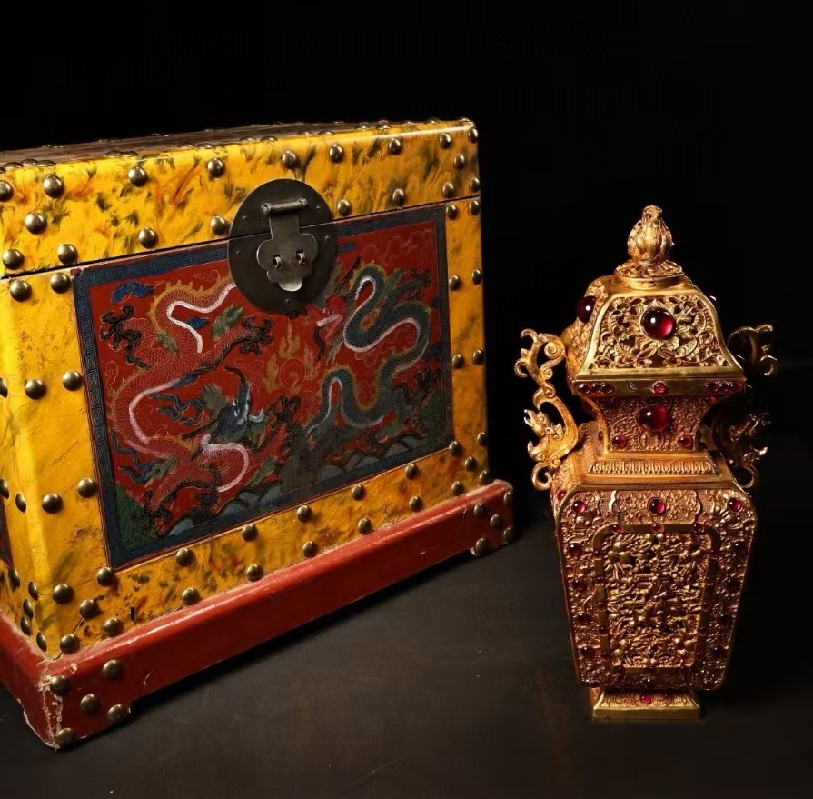 > 清代 花瓶 旧蔵 乾隆年制 チベット古寺 古銅透かし彫り金モザイクルビー花瓶 銅製 銅琉金 唐物 收蔵品 時代物 古置物 供養品 文房具 仏教