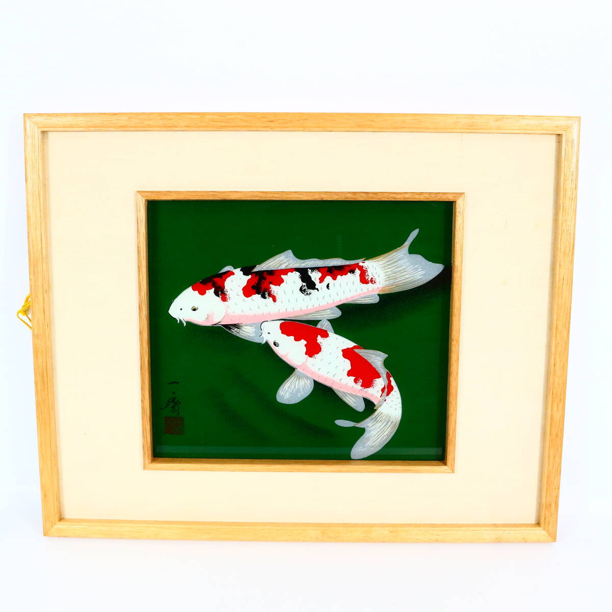 - 【真作】一齋 鯉 裏絵 ガラス絵 額装 アート 幸運 開運 インテリア 模写