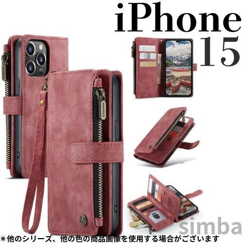- iPhone 15 ケース 財布型 手帳型 スマホカバー ストラップ付き カード収納 大容量 多機能 スタンド機能 レッド