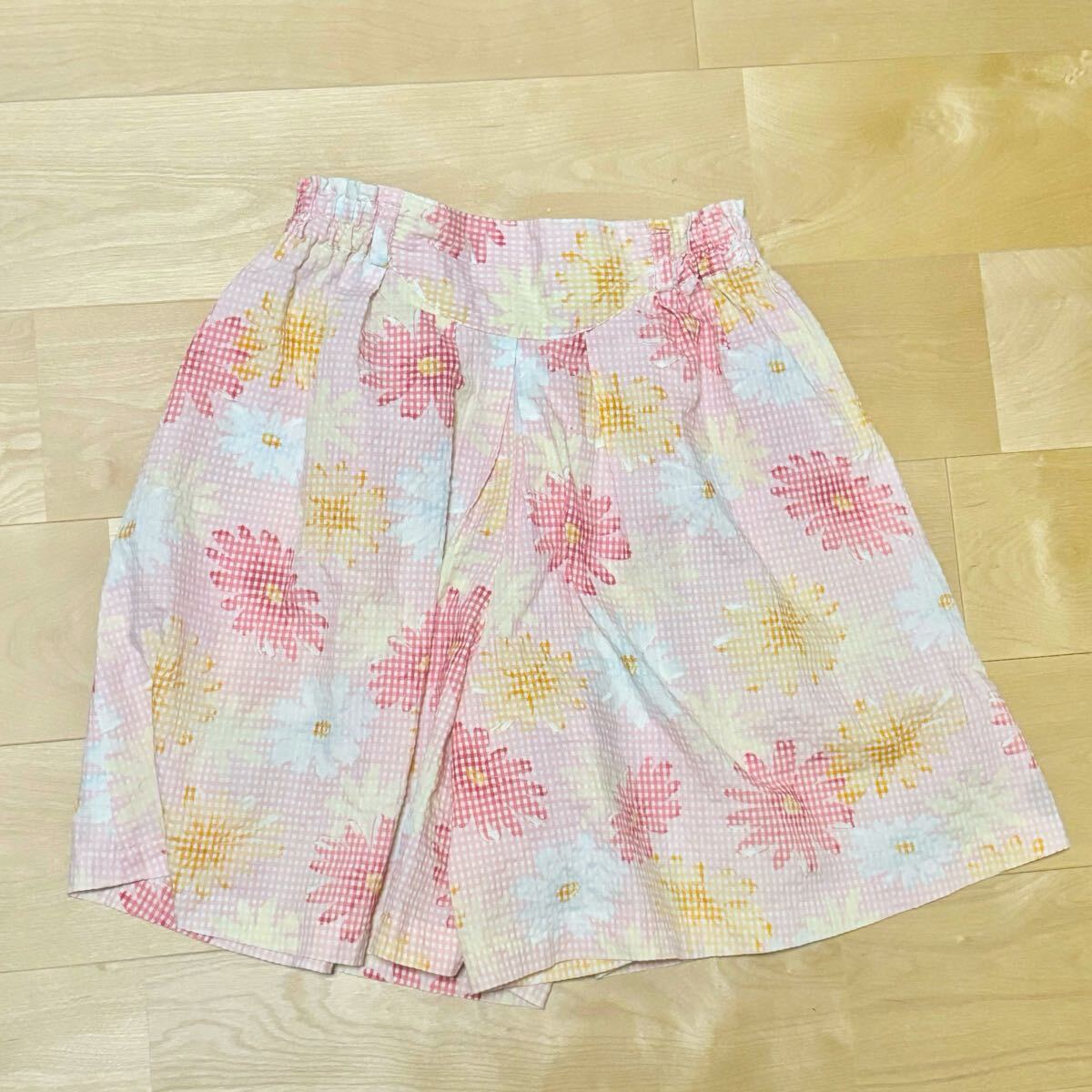 - 背面ウエストゴム綿ショートパンツ ピンクフラワー半ズボン お花 キュロットスカート キュロットパンツ ボトムス