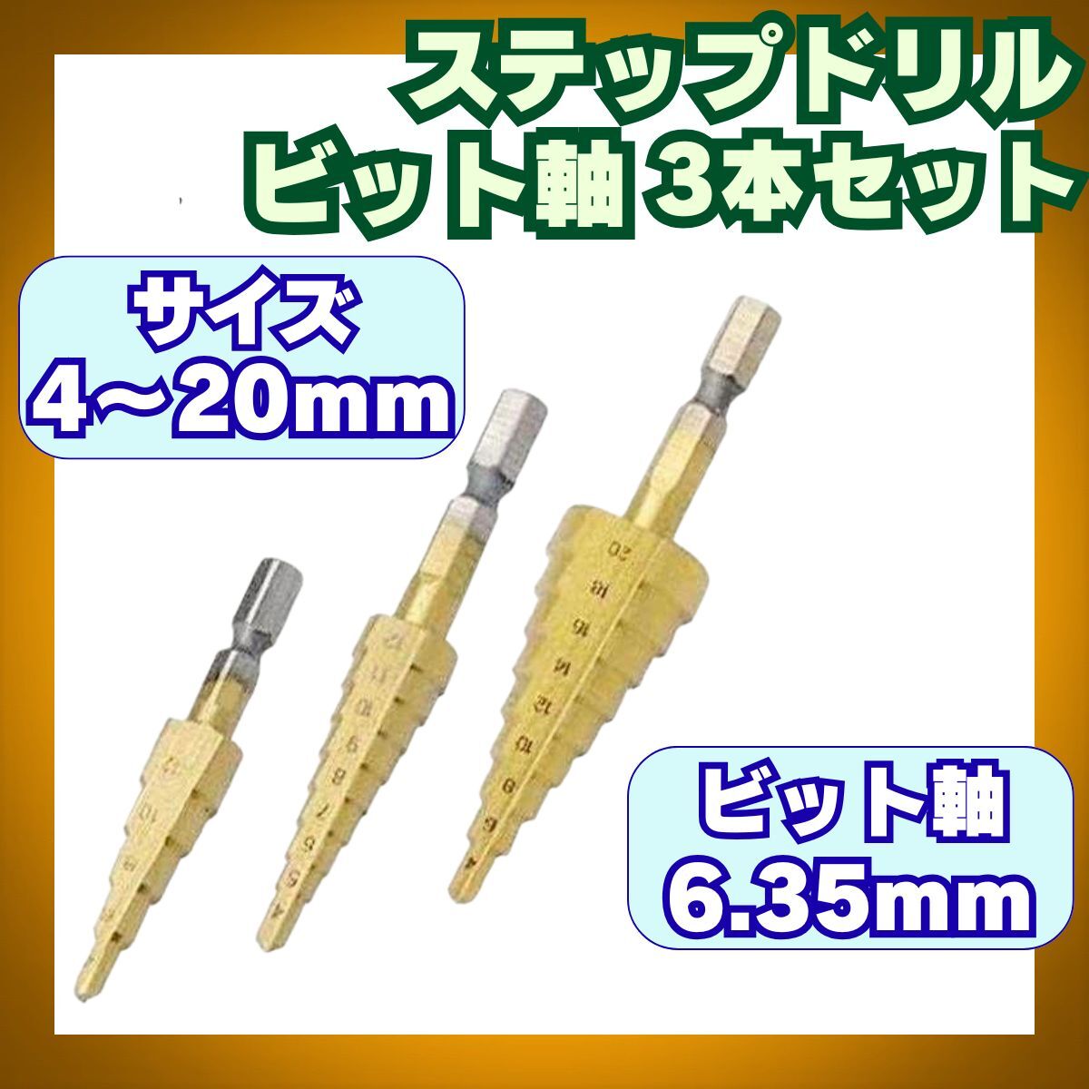 - ステップドリル 3本 ビット軸 6.35mm 4~20mm 専用ケース付 502