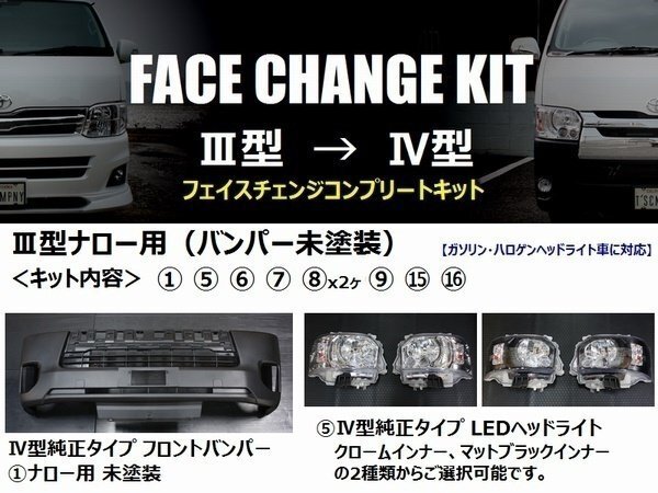 > ▼ 特価 ハイエース レジアスエース 200系 ナローボディ [3型 → 4型] フェイスチェンジキット バンパー未塗装 S-GL / DX / GLパッケージ