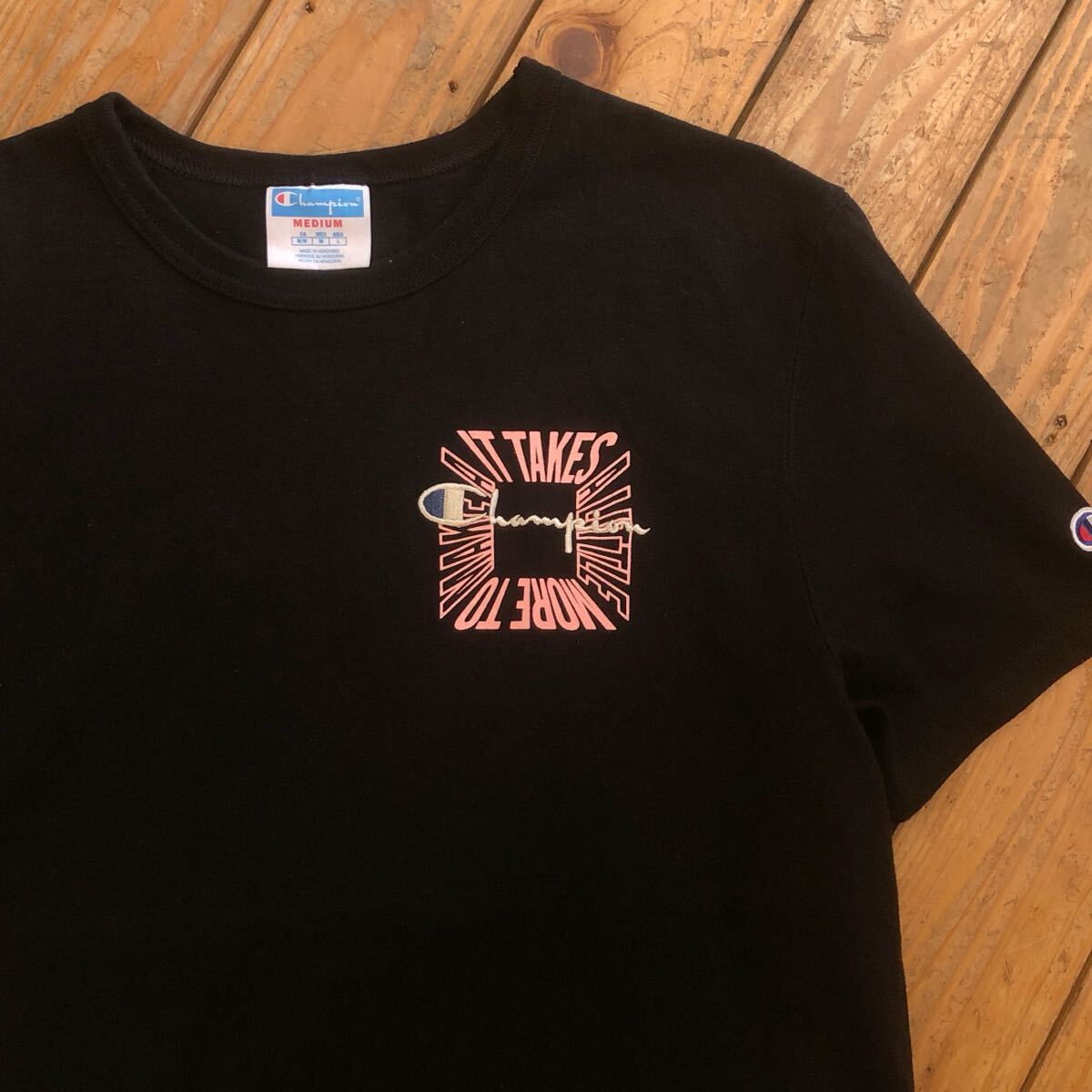 > USA古着 Champion チャンピオン Tシャツ メンズ Mサイズ ブラック 黒 刺繍 カジュアル 丸首 カットソー トップス おしゃれ T3090