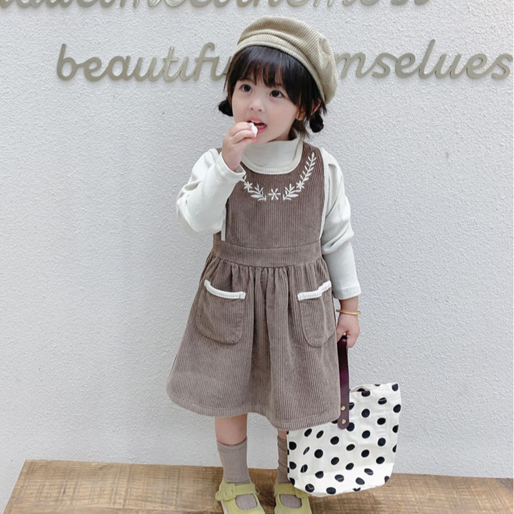 > ☆ ブラウン ☆ 130cm ☆ ワンピース コーデュロイ 刺繍 女の子 ワンピース キッズ コーデュロイワンピース 刺繍 厚手 ジャンパースカート
