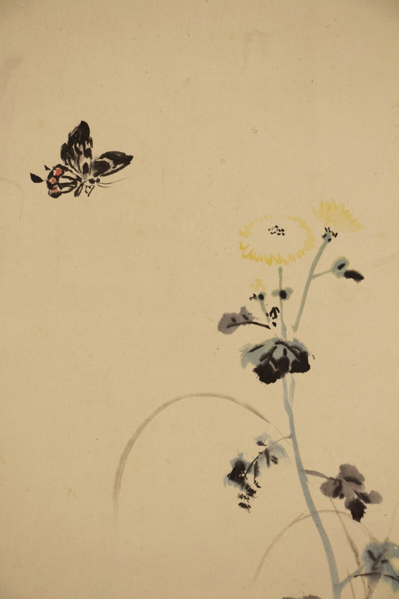 - 【真作 本多天城箱書】掛軸「狩野芳崖 菊蝶図」幕末明治 日本画家 狩野晴皐子 狩野勝川院門下 東京美術学校設立 山口県生 動物画 絵画