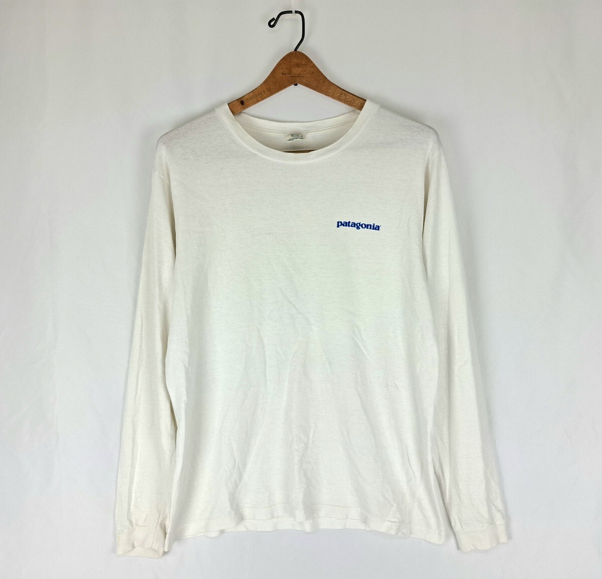 - バックプリント 90s~ USA製 PATAGONIA Beneficial T's オーガニックコットン 長袖Tシャツ 白 S 90年代~ アメリカ製 ビンテージ vintage