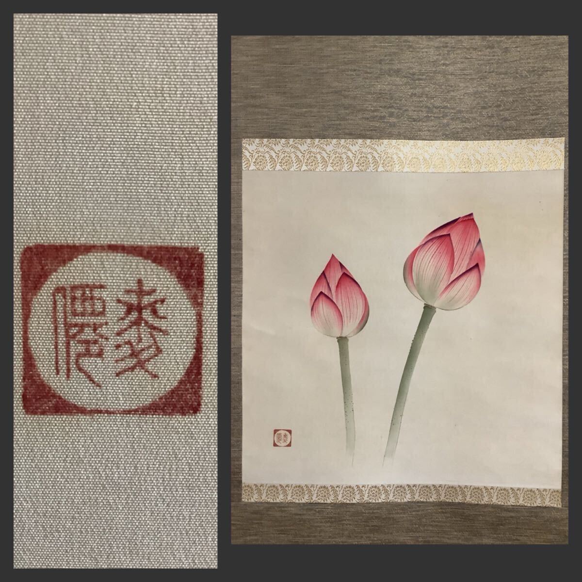 > 【模写】掛軸Jul716B[土田麦僊 蓮図]着色絹本 書いたもの 木箱/日本画 花鳥画 書簡 手紙 ハガキ 大正昭和期 竹内栖鳳師事