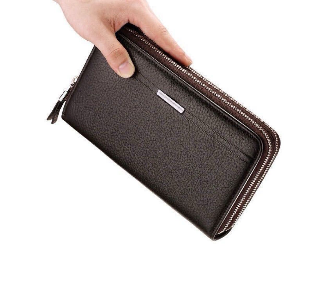- ダブルジッパー 長財布 大容量 メンズ 男性用 財布 ウォレット 小銭入れ PUレザー ダブルファスナー ブラウン