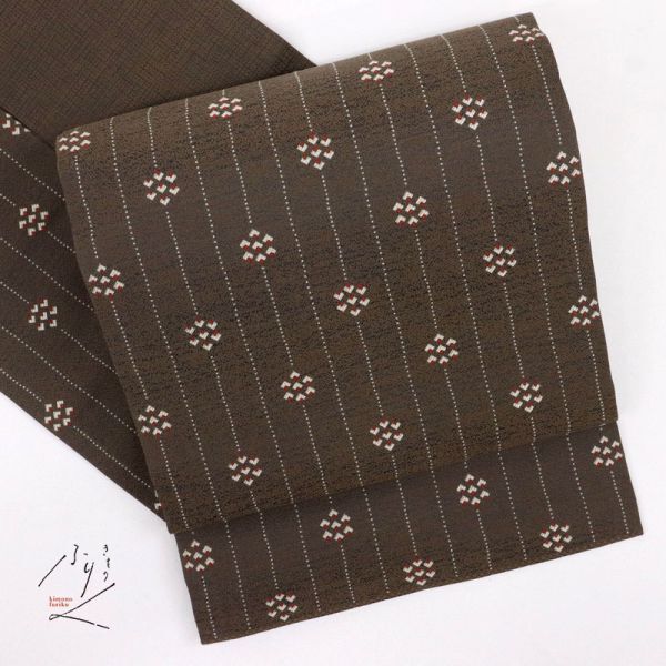- 【名古屋帯】 特選 ドットのラインに小さな花模様 黒茶 正絹着物 NC3-20