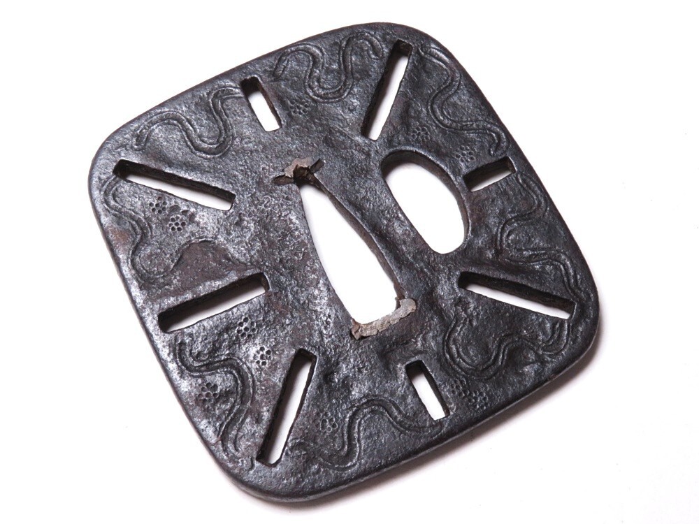 - 【10746】刀装具 (検/甲冑/刀/縁頭) 鉄地 四方 鍔(初品・買取品)