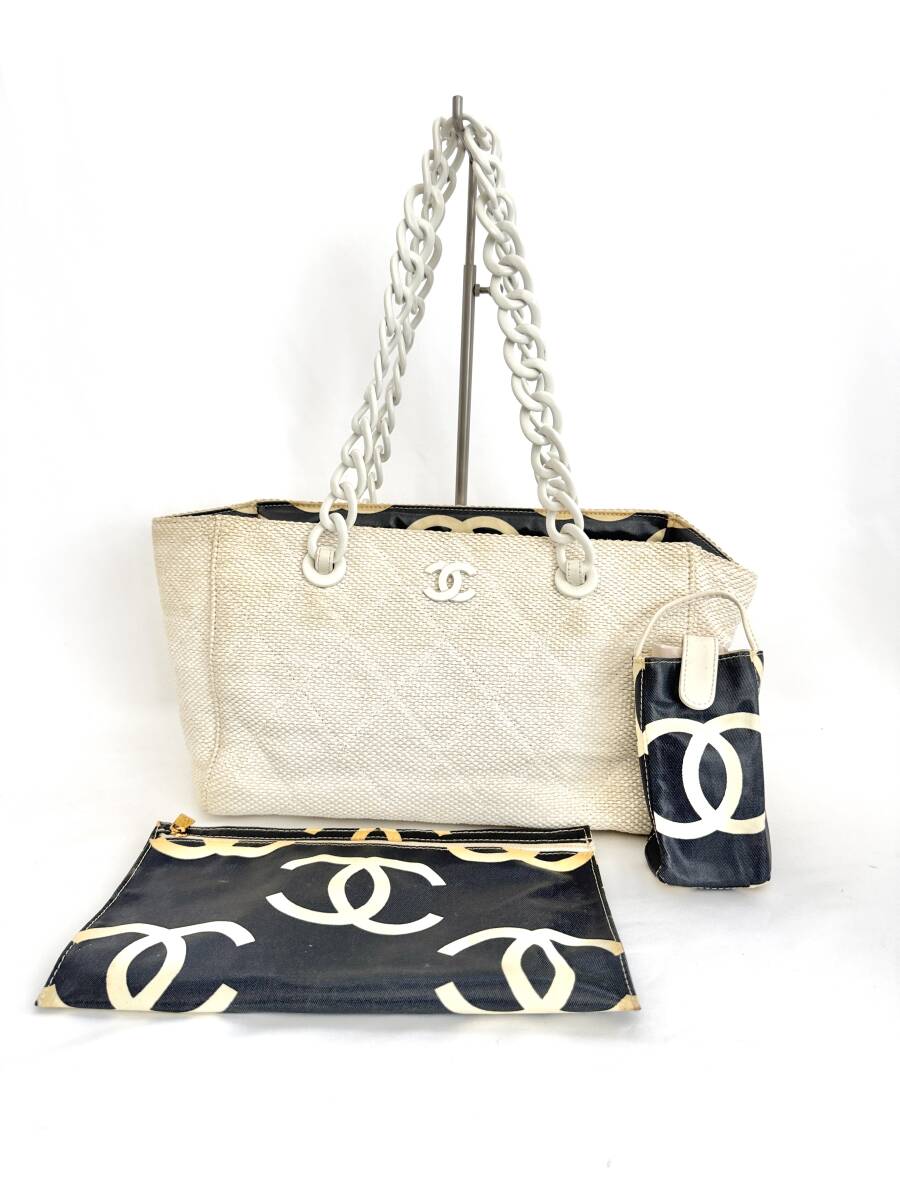 - 7F1512【本物保証】シャネル プラ チェーン ショルダー トート バッグ マトラッセ キャンバス ホワイト ココマーク CHANEL