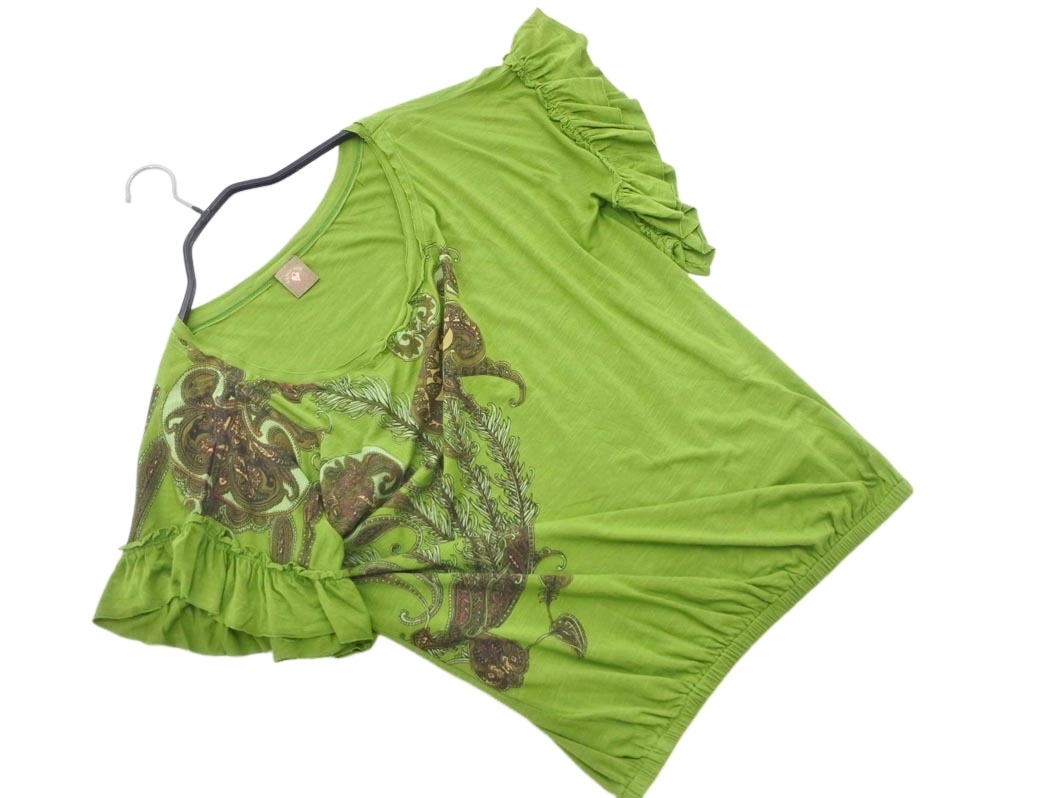 - ネコポスOK Language ランゲージ プリント フリル カットソー sizeS/緑 ■◆ ☆ fga9 レディース