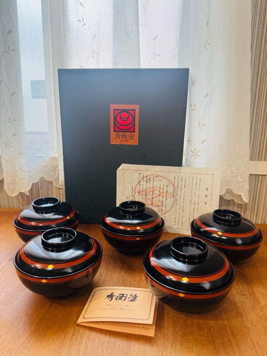 - 【2】【未使用】秀衡塗 丸三漆器 漆塗 牡丹型 吸物椀 汁椀 蓋付 お椀 5個セットまとめ