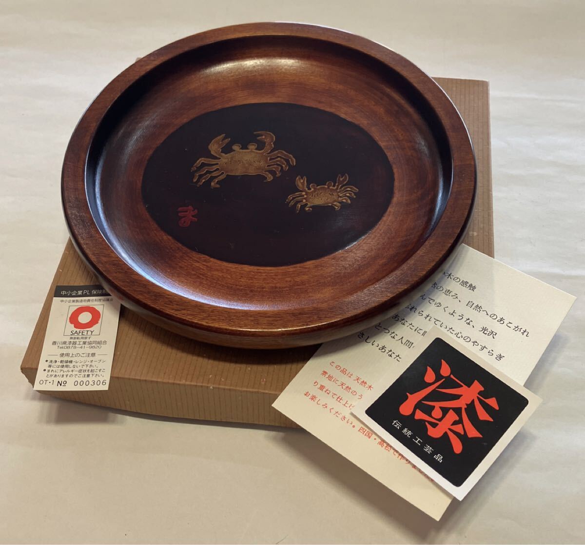 - 讃岐漆器 菓子器 浅菓子鉢 天然木 親子蟹 未使用保管品