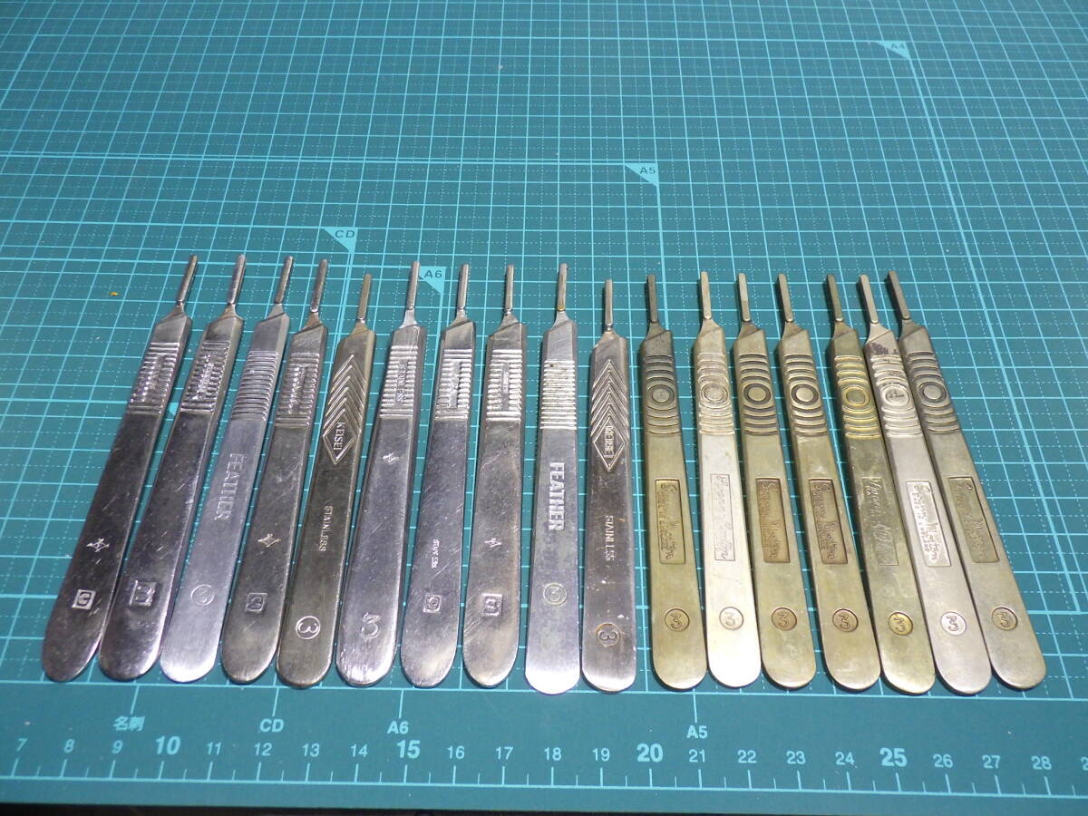 - D333#全国配送230円 動作品 17点まとめて メスホルダー メスハンドル 真鍮製 スワンモートン Swann Morton KEISEI FEATHER 3番 医療 道具