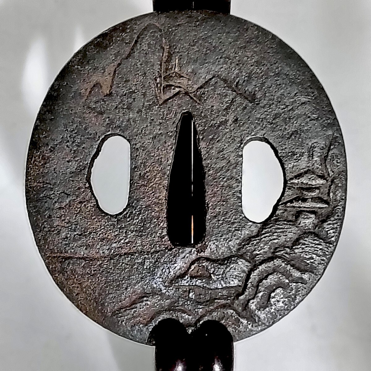 - 【A3699】鉄地 山水図彫刻 刀鍔 つば ツバ 鐔 金工細密彫刻 刀装具 日本刀装具 刀剣美術 骨董品 アンティーク