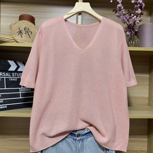 - 25zy サマーニット シンプル トップス 高質 ラフ 麻タッチニット チュニック ナチュラル 麻混 サラサラ 涼感 Vネック1