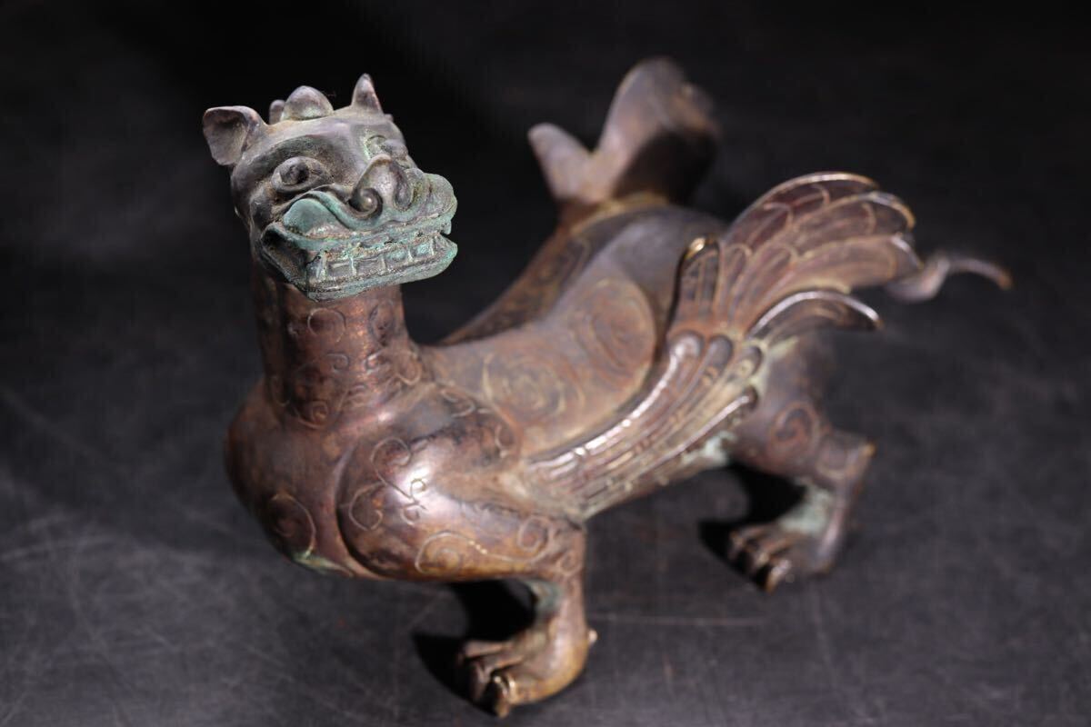 - 時代 古銅 神獣 置物 / 時代物 銅製 金工 彫金 中国美術 煎茶飾 .G1999